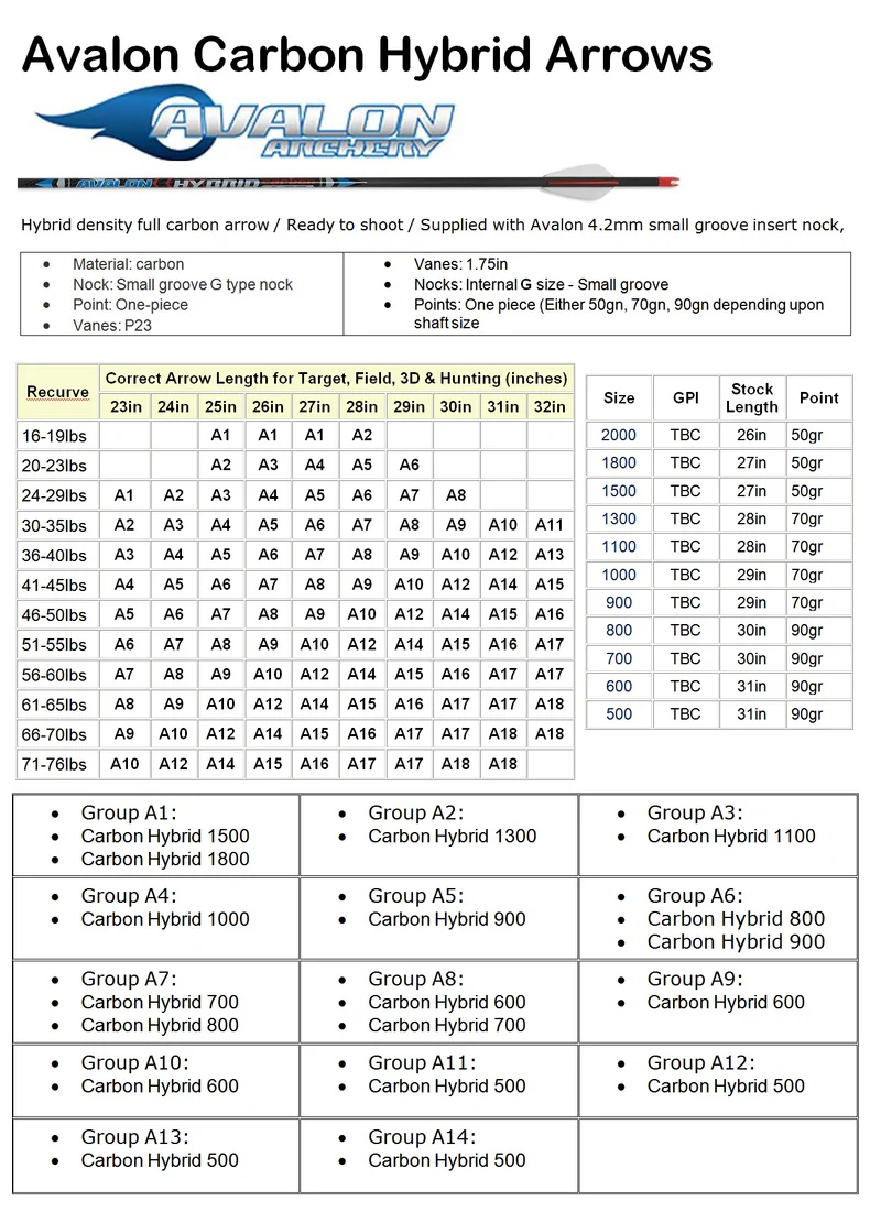 Her kan du se hvilken spine der måske vil passe til din buestyrke og træklængde, dette er kun en vejledning.